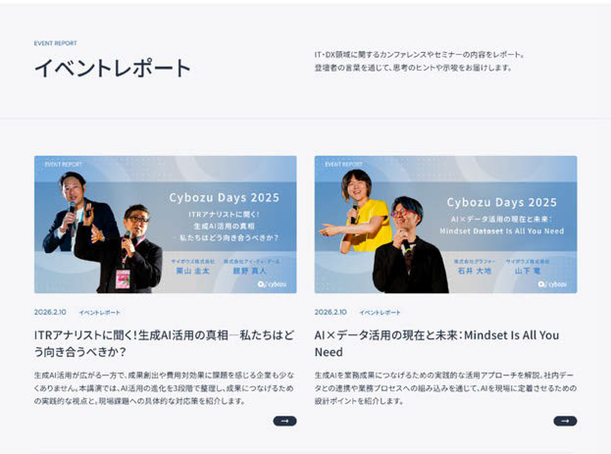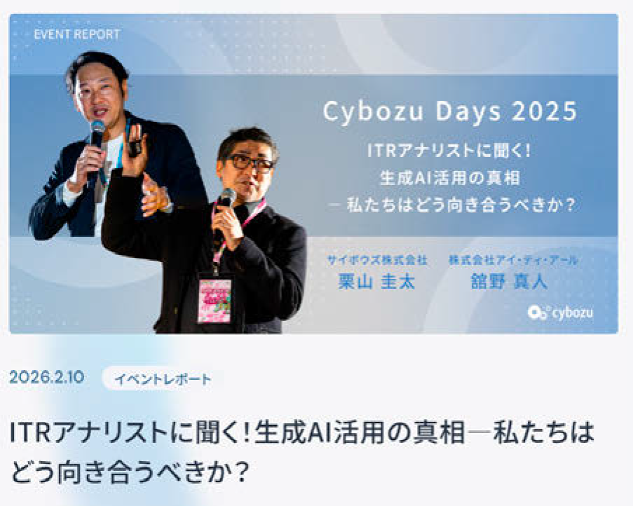 同社開催のIT・DX領域に関するカンファレンスやセミナーの内容を整理して公開。「ITRアナリストに聞く!生成AI活用の真相―私たちはどう向き合うべきか?」では同社イベント「Cybozu Days」の模様を動画と共にレポートしている。