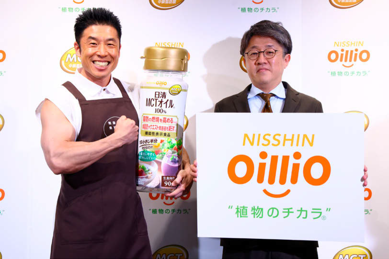 なかやまきんに君(お笑いタレント)、大塚竜太(日清オイリオグループ 食品事業本部 ウェルネス食品事業戦略部長) |