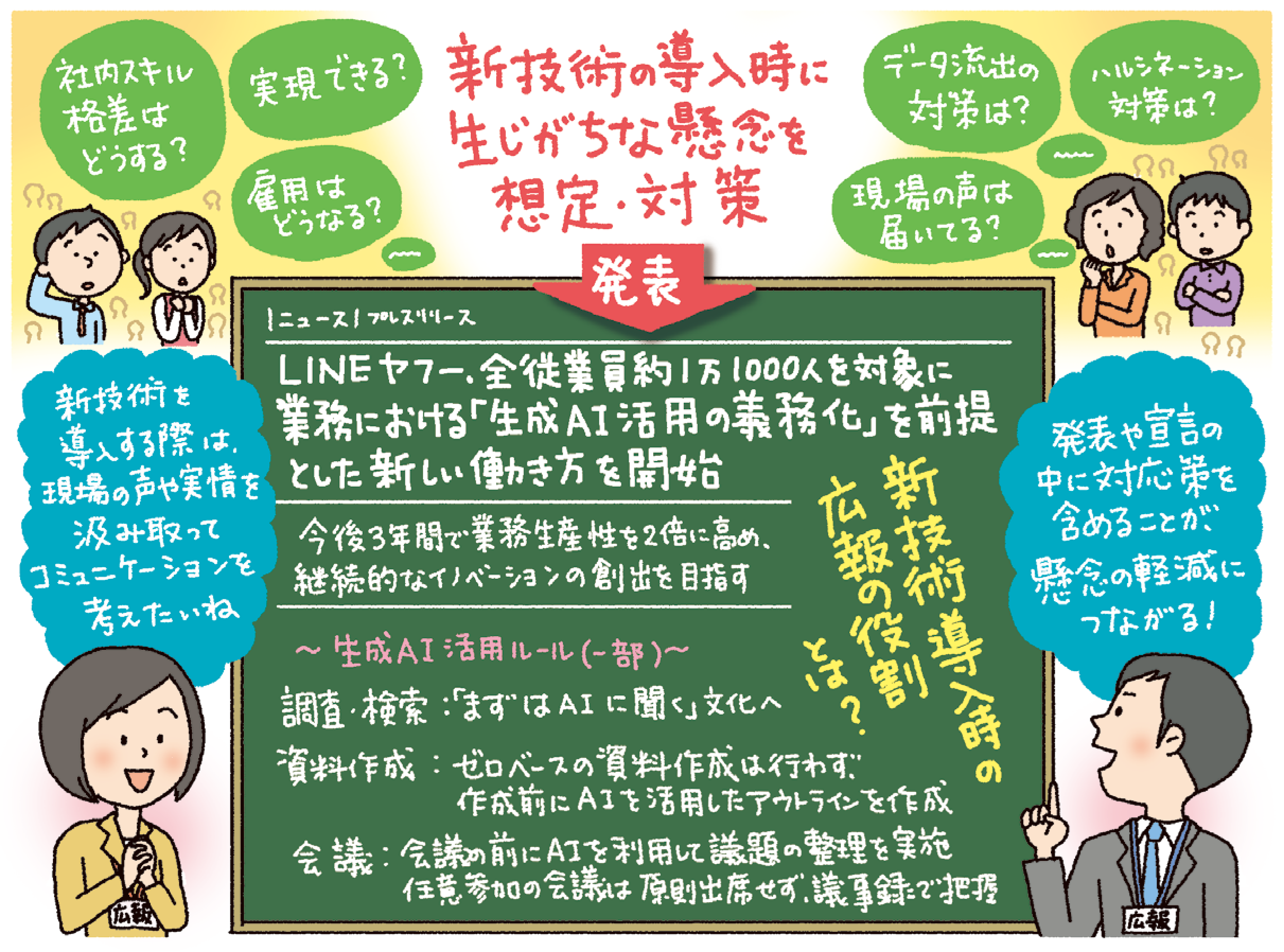 7月、LINEヤフーは全従業員約1万1000人を対象に、業務における「生成AI活用の義務化」を前提とした新しい働き方を開始すると発表した。今後3年間で業務生産性を2倍に高め、継続的なイノベーションの創出を目指すという。同社では「まずはAIに聞く」「ゼロベースの資料作成は行わない」といった具体的ルールを策定する。