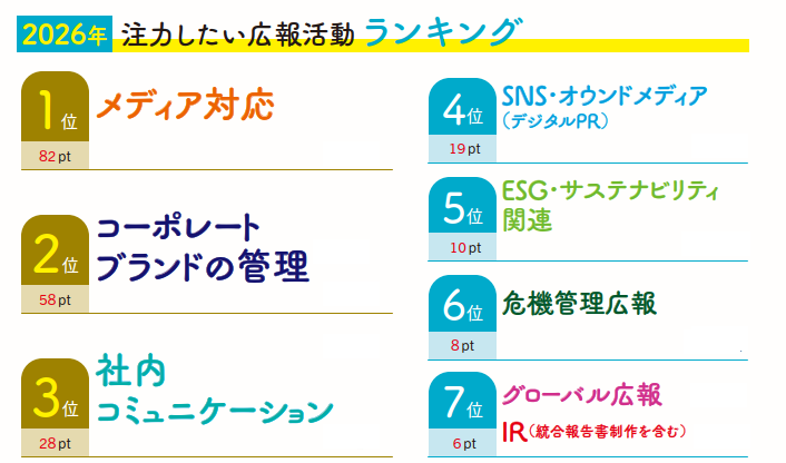 2026年に注力したい広報活動は、「メディア対応」がトップ。それに「コーポレートブランドの管理」が続くのは例年通りだった。ただ、社内コミュニケーションの重要度がやや増したようだ。広報以外に広告宣伝などの業務を担当している例も見られた。