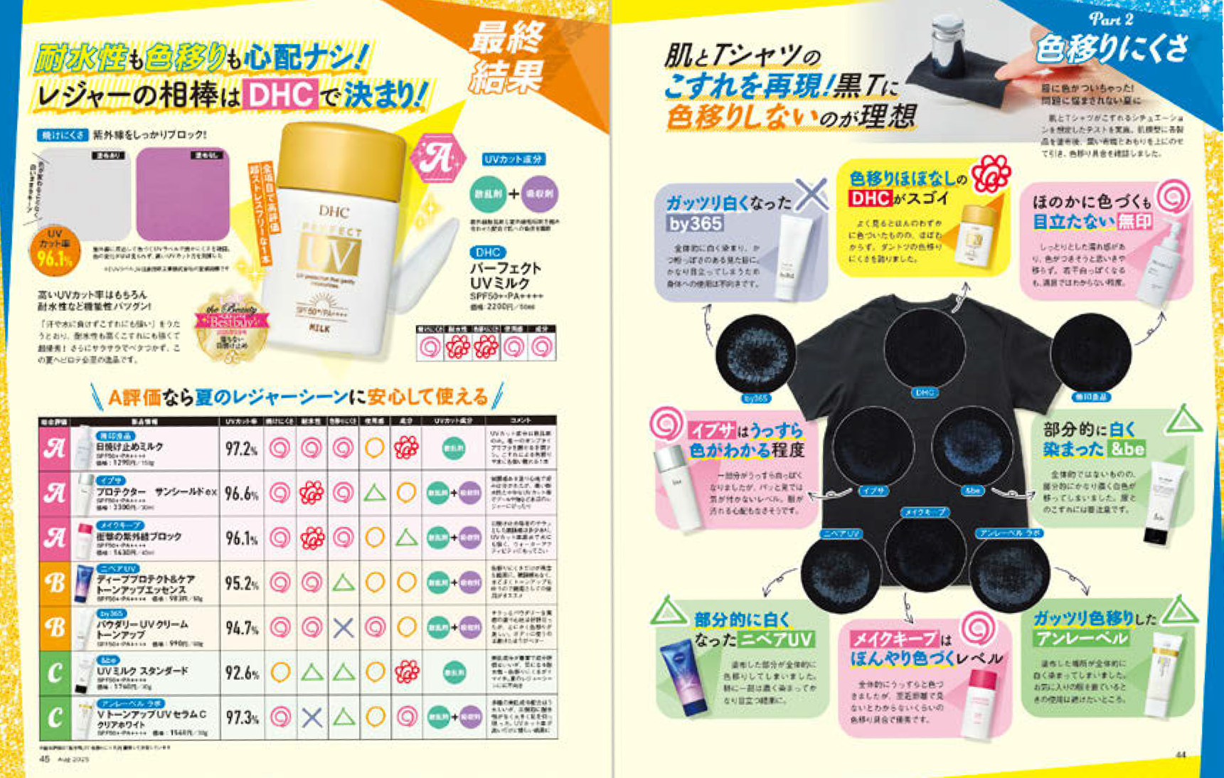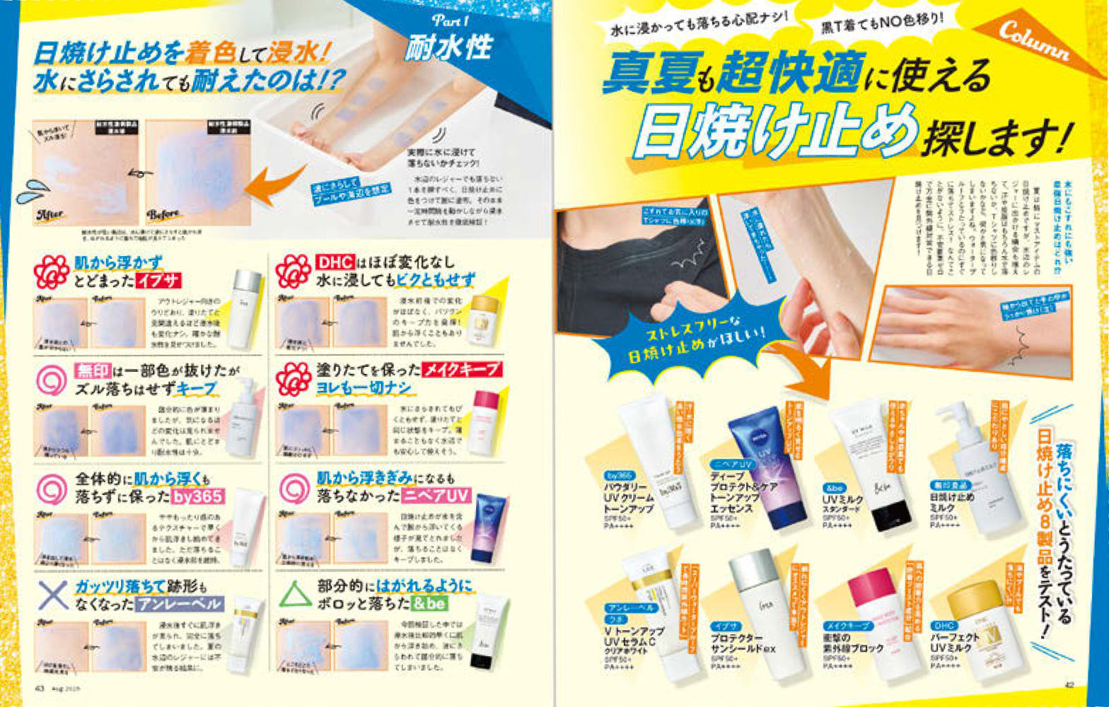 夏恒例の「落ちないコスメ」特集(2025年8月号)。日焼け止めの水やこすれへの強さを、耐水性テストや黒Tシャツへの色移りテストなどで徹底的に検証。