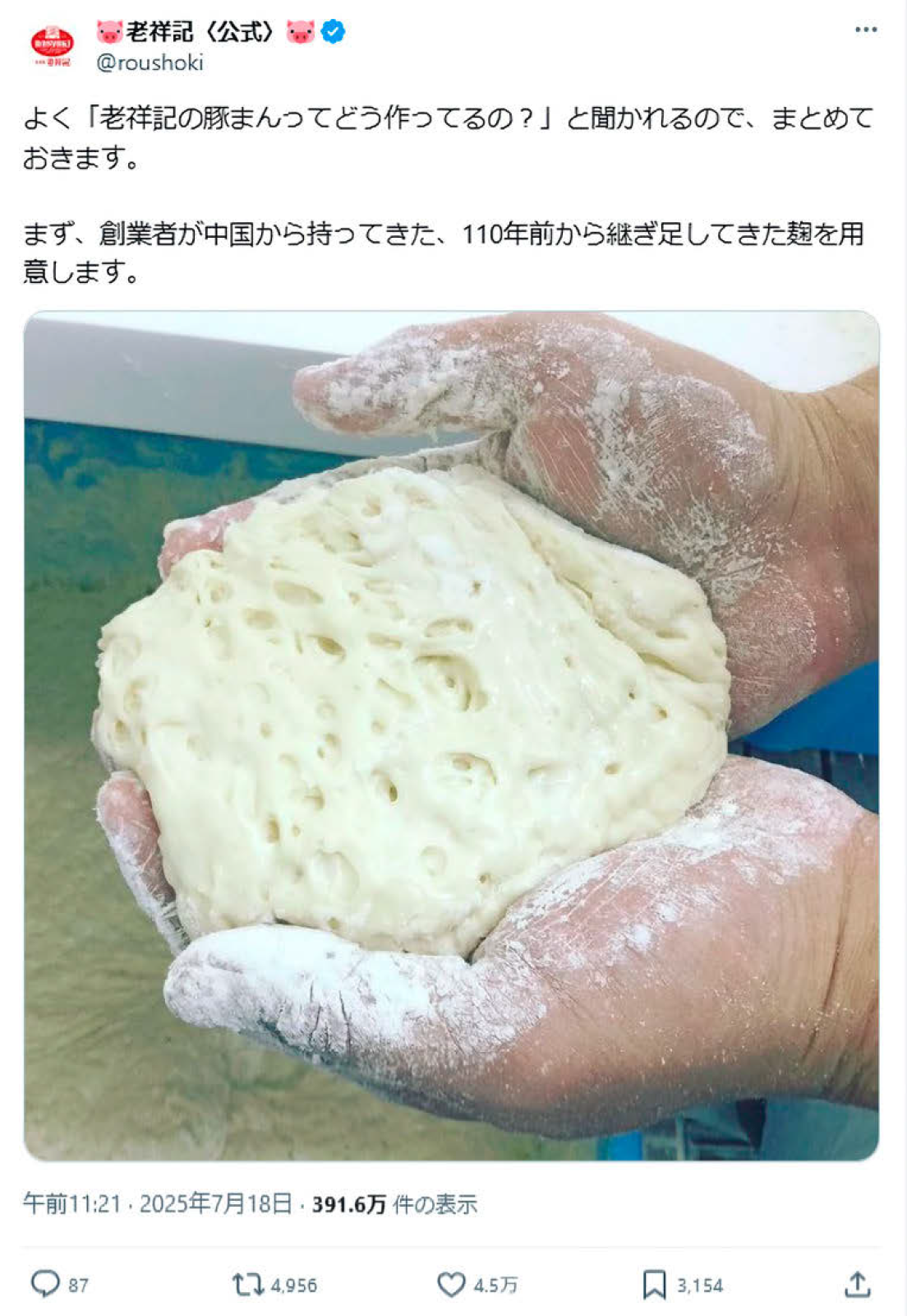 2025年7月18日にXに投稿した「老祥記の豚まんってどう作ってるの?」は...