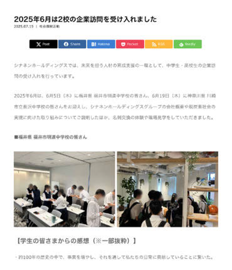 公立中学校による企業訪問の様子をまとめて紹介。記事末尾に企業訪問の応募フォームも記載することで、次のビジネスチャンスに繋げる。