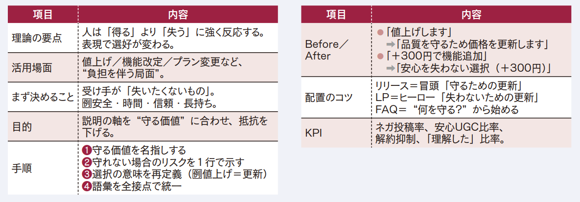 ① プロスペクト理論:負担や改定を “守る理由” に置き換えて伝える。