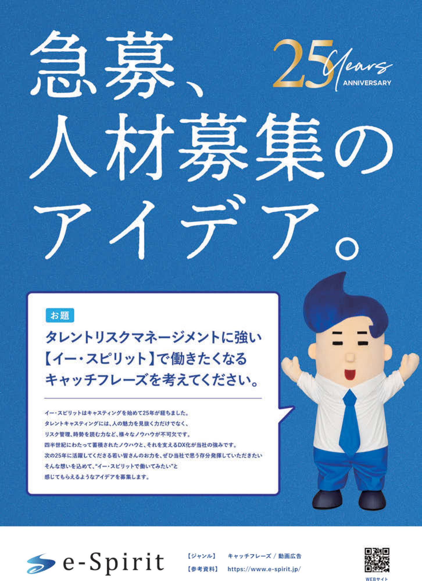 ①当社は、キャスティング領域で25年にわたり経験とノウハウを培ってきました。 その中で築いてきた「広告キャスティングにおけるリスクマネジメントのプロ」としての姿勢や信頼感が伝わり、“イー・スピリットで働いてみたい”と感じてもらえるようなキャッチフレーズを募集します。