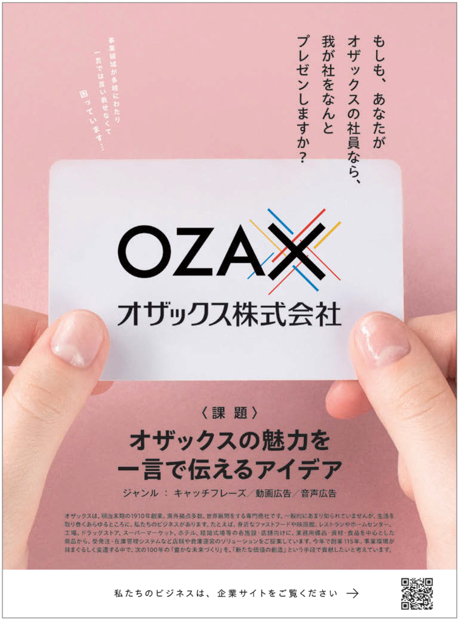 ① 当社は、100年以上にわたる歴史の中で培ったノウハウを有し、多くの大手有名企業との取引実績があります。 人々の生活を取り巻くあらゆるところに当社が手掛けた商品やサービスがあり、社会インフラの一部として機能していると考えています。 そうした多くの実績を、他社のブランド名を借りることなく「オザックス」の名前でアピールできるアイデアを期待しています。