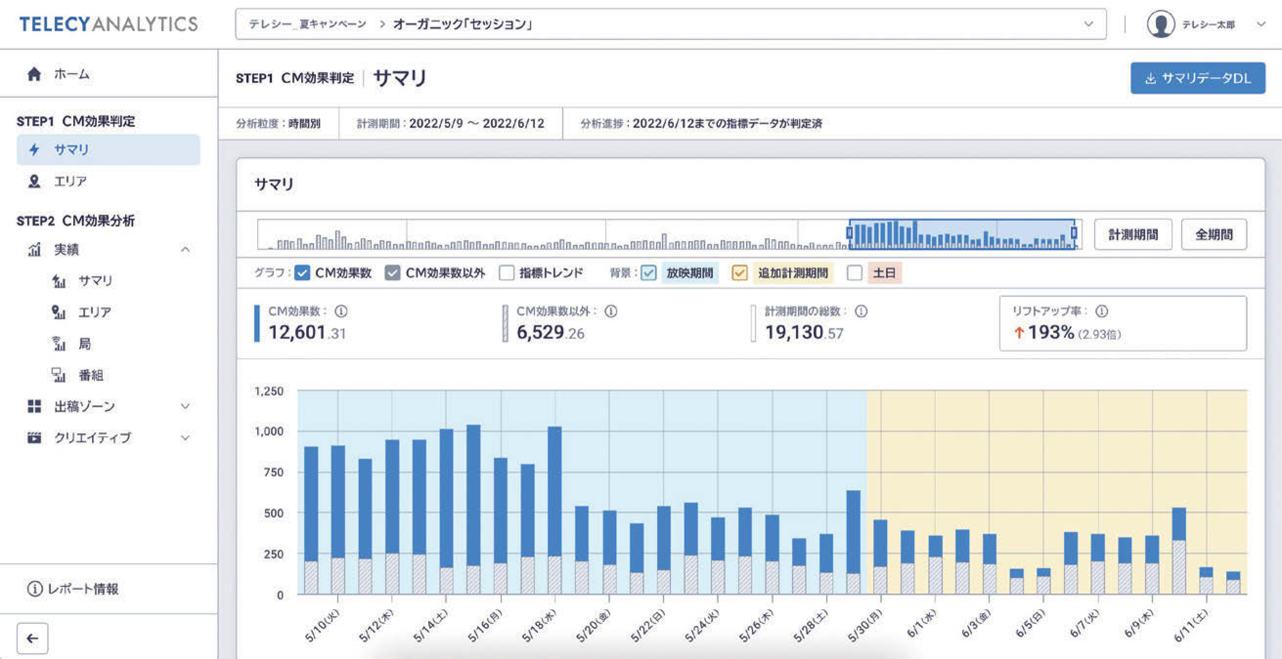 「テレシーアナリティクス」のダッシュボード。テレビCMの効果を包括的に分析する「シーケンシャルレスポンス分析」と、放映枠ごとの貢献度を分析する「ダイレクトレスポンス分析」の2つのモデルはいずれも特許を取得。これにより、クリエイティブの質や番組の質を、より精密に評価することが可能になった。