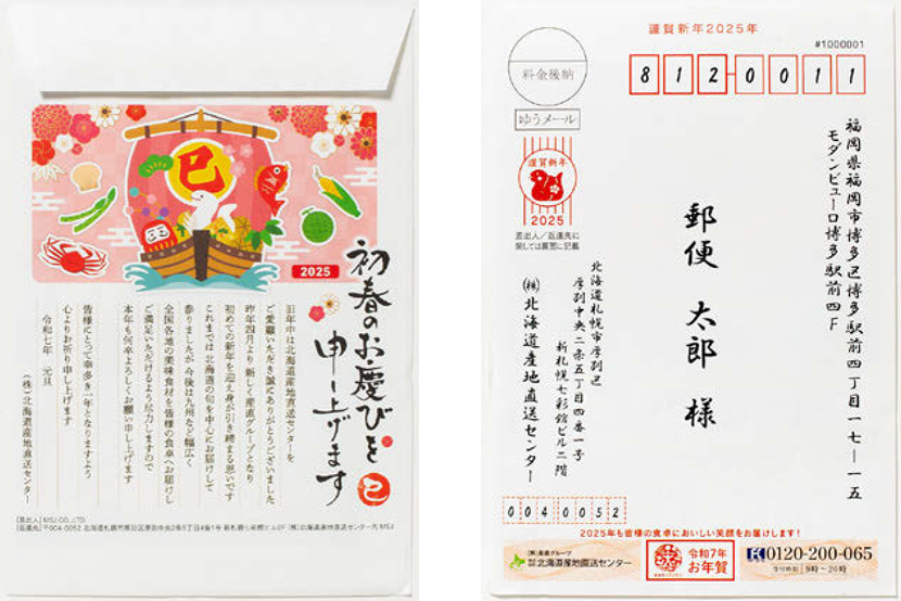 年賀状そっくりになるよう住所や宛名の位置にもこだわった。ロイヤル顧客には縁起のよいすりごま(おみくじ付)のノベルティを同封。