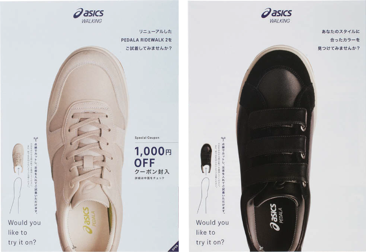 圧着展開型のDMの外面にはほぼ原寸大の商品画像を印刷し、足入れ部分の点線に沿ってカットすることで足首を入れて擬似的に試着できるように。
