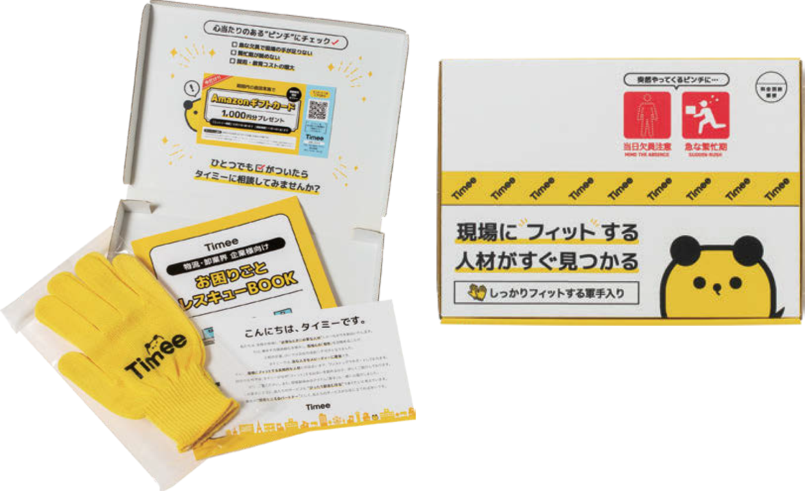 スキマバイトのマッチングサービスを提供するタイミーは、物流・卸事業者をターゲットにDM施策を実施した。物流・卸事業者は、人手を必要としているにもかかわらず、新規開拓の架電営業では決裁権者にまで届きにくいという課題を抱えていた。そこでターゲットになじみのある段ボール型のDMに業務を想起させ、保存性もある黄色い軍手を同梱したDMをドアノックツールとして、タイミーの認知とサービス内容の周知を目指した。1935通を発送し、架電営業時のDM認知率62.2%を達成したほか、今まで接点の持てなかった企業との商談機会が生まれ、複数社の新規受注につながった。