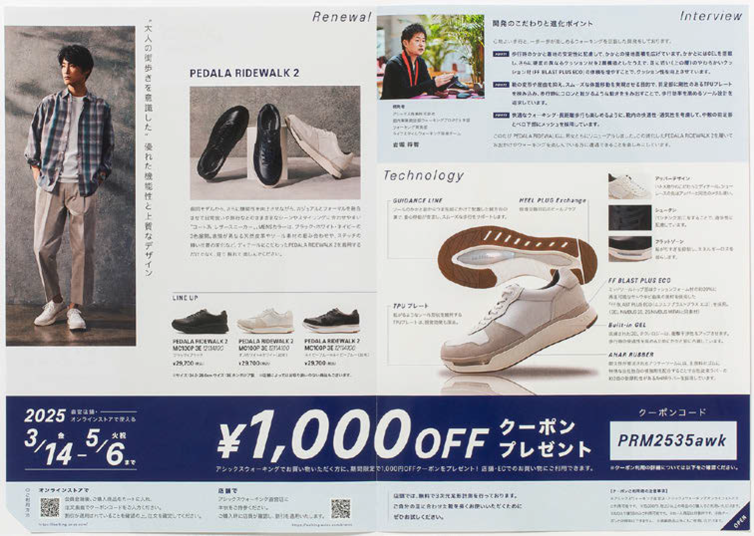 アシックスウォーキングの「PEDALA RIDEWALK」がリニューアルし「PEDALA RIDEWALK2」となった。この告知と、前モデルからの買い替え促進、およびアップセル、休眠顧客の活性化を目的にDM施策を実施した。ターゲットは前モデルの購入者を中心に、スニーカーカテゴリーの購入履歴者と顧客セグメントの上位会員をセグメント化。CPM分析を用いて、優良顧客や、DMへの反応が良さそうな顧客を抽出したほか、離反期間が810日までの顧客がDMへの反応が高いという過去実績データも参考にした。
