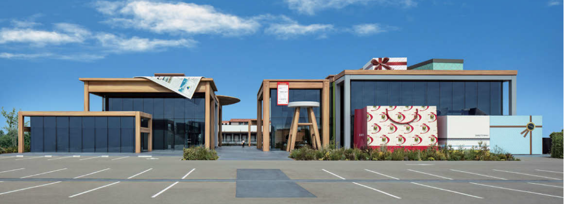 2021年4月にオープンした複合施設「SWEETS BANK(スイーツバンク)」。浜松いわた信用金庫と協業し、春華堂の本社機能のほか、「SHOP春華堂」、浜松いわた信用金庫森田支店、コミュニティスペースなどを併設している。建物のデザインは、テーブルと椅子をイメージしており、同社が大切にする「団らん」を表現する。