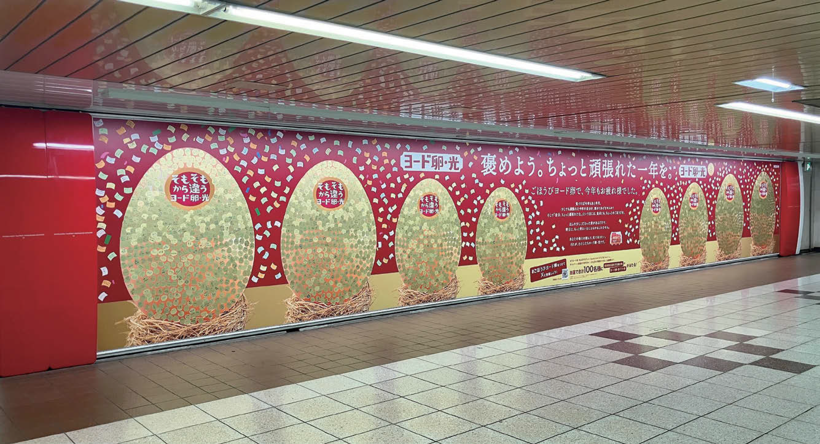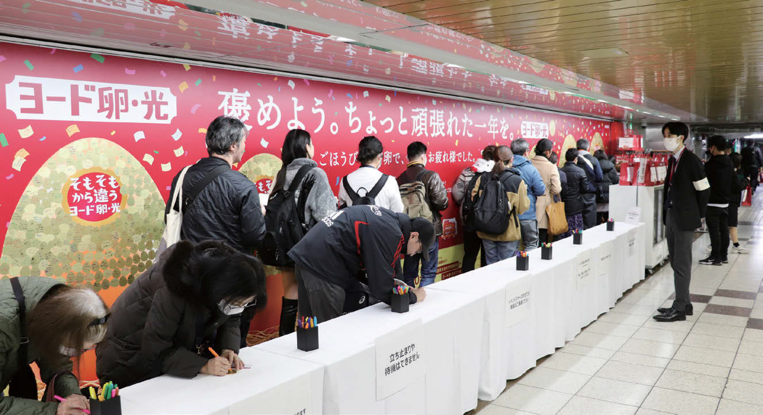 日本農産工業が展開するブランド卵「ヨード卵・光」は、付箋広告と卵のサンプリングを連動したプロモーションを、2025年12月15日より新宿駅構内で実施した。1年の締めくくりに「ちょっと頑張れた自分」を労うご褒美として「ヨード卵・光」の魅力を訴求する施策だ。