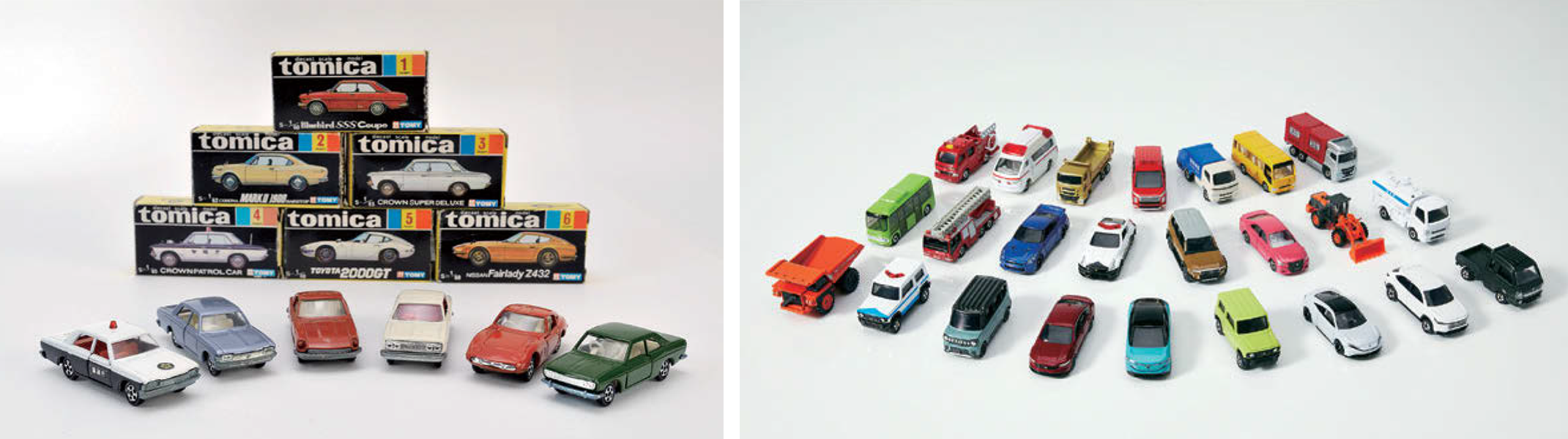 (左)1970年に発売した初代トミカ。 (右)現在のトミカ。