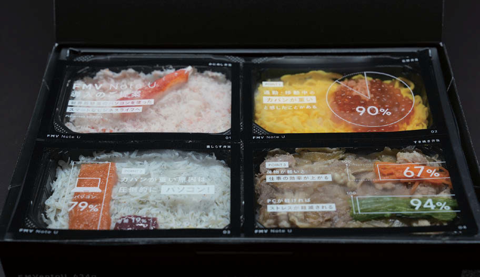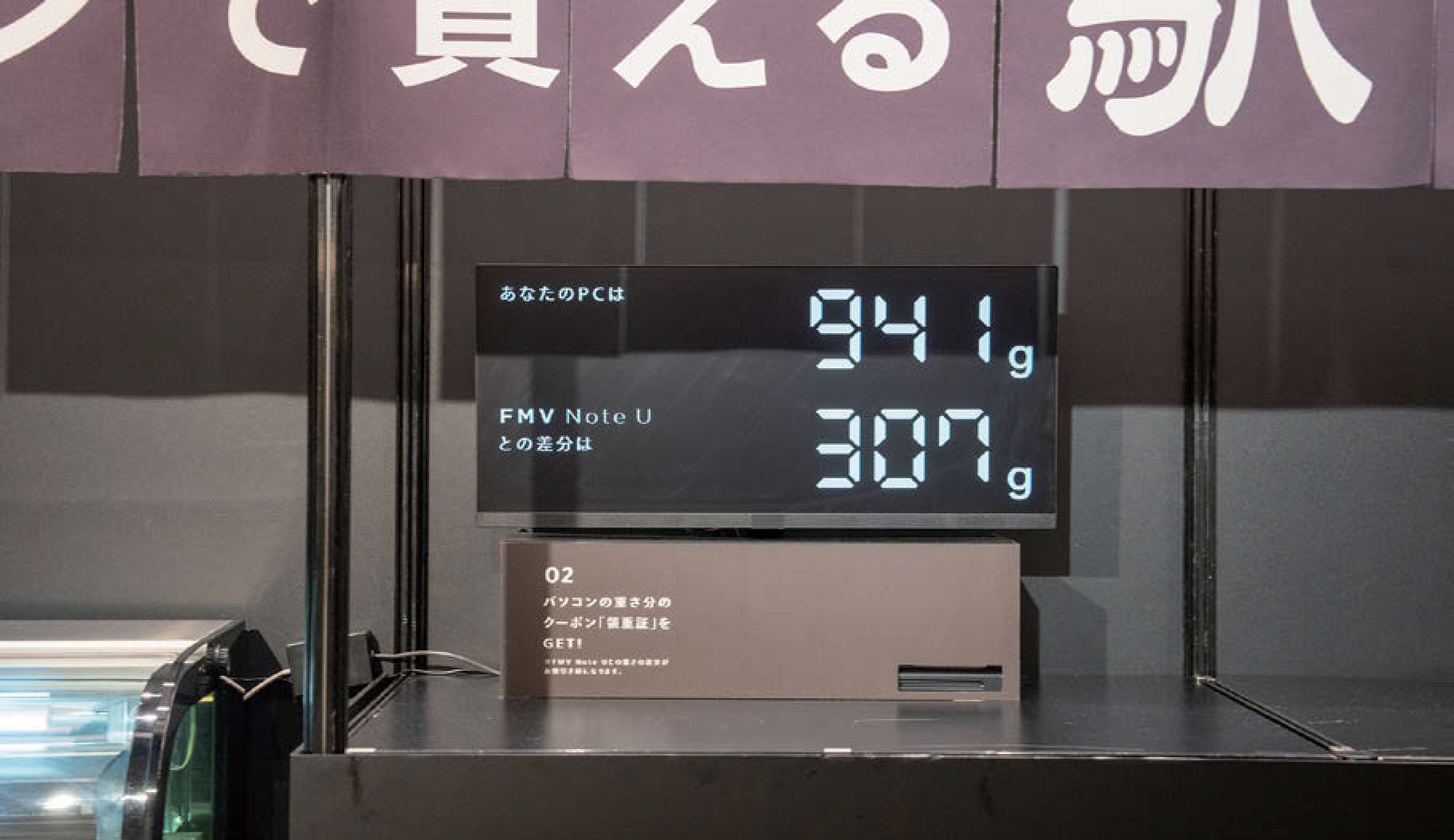 富士通クライアントコンピューティングは、東京駅でイベントを開催。同社の世界最軽量ノートパソコンと同じ重さの弁当を販売し、来場者が持参したノートPCとの重量差に応じて割引した。