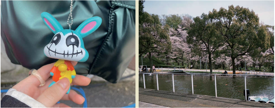 『女神降臨』の撮影現場での写真と、大学のキャンパスでお花見をした時の写真(本人提供)。