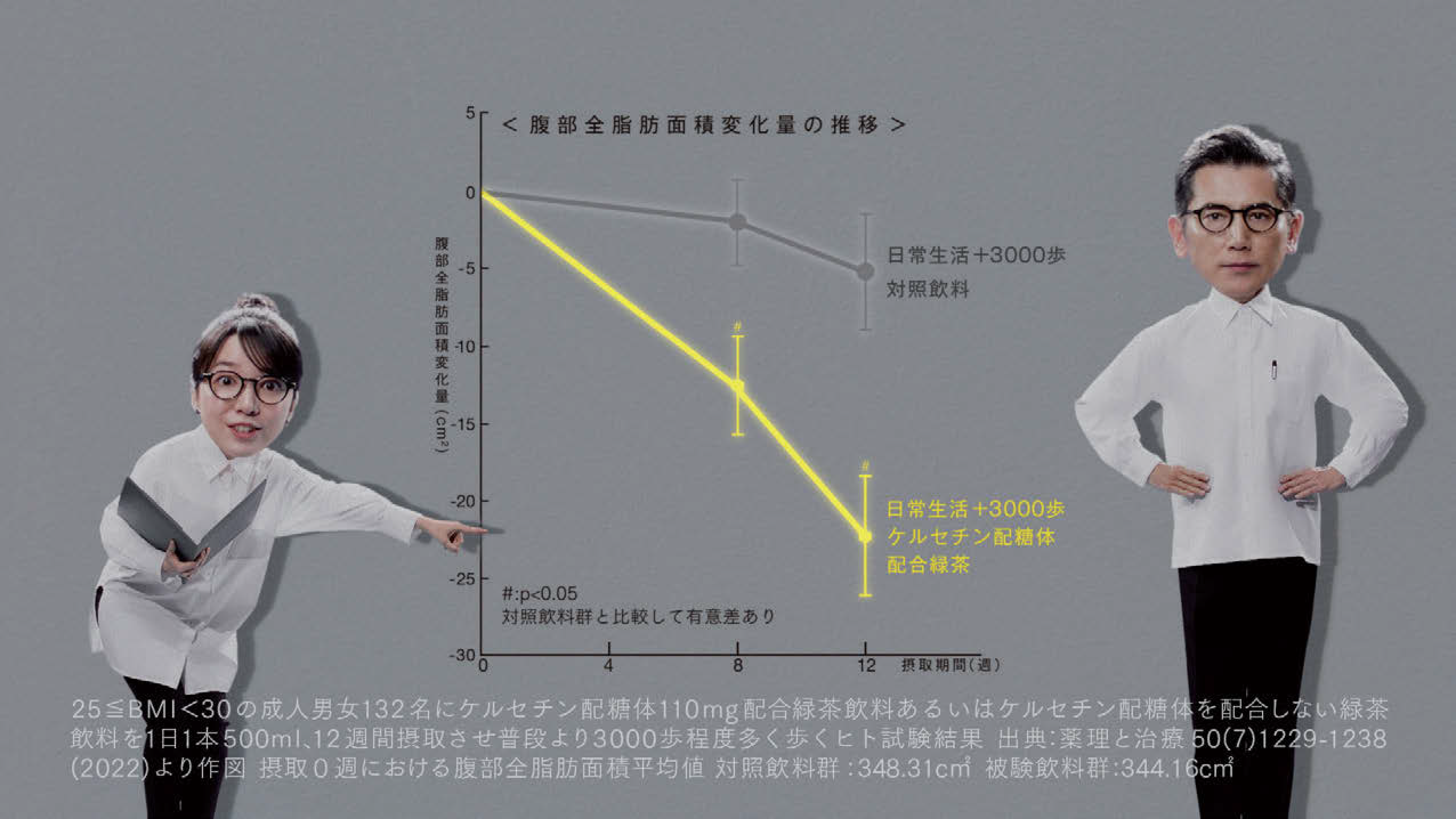 テレビCM「特茶研究所伸びるグラフ」篇より。同ブランドは2022年にパッケージを含む大幅リニューアルを行い、2023年よりコミュニケーションを刷新。本木雅弘さん・上白石萌音さんを起用し、「グラフ」を大きく示してエビデンスを訴求する「特茶研究所」シリーズを展開している。