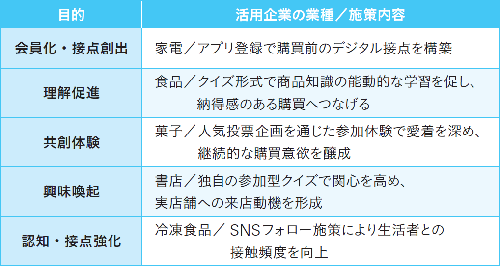 「QUOカードPay」のキャンペーン活用は、商品購買を直接的に促す施策に限らない。登録・参加・理解促進など、生活者の行動喚起を目的に活用されている。上記は、最近の「QUOカードPay」を活用したキャンペーンの一例。