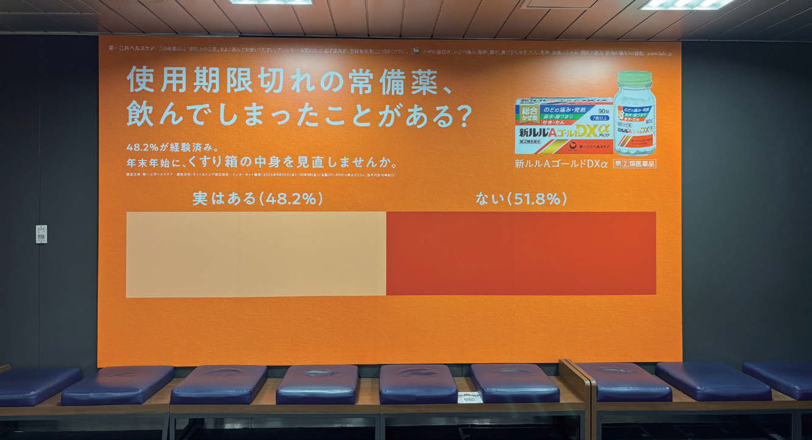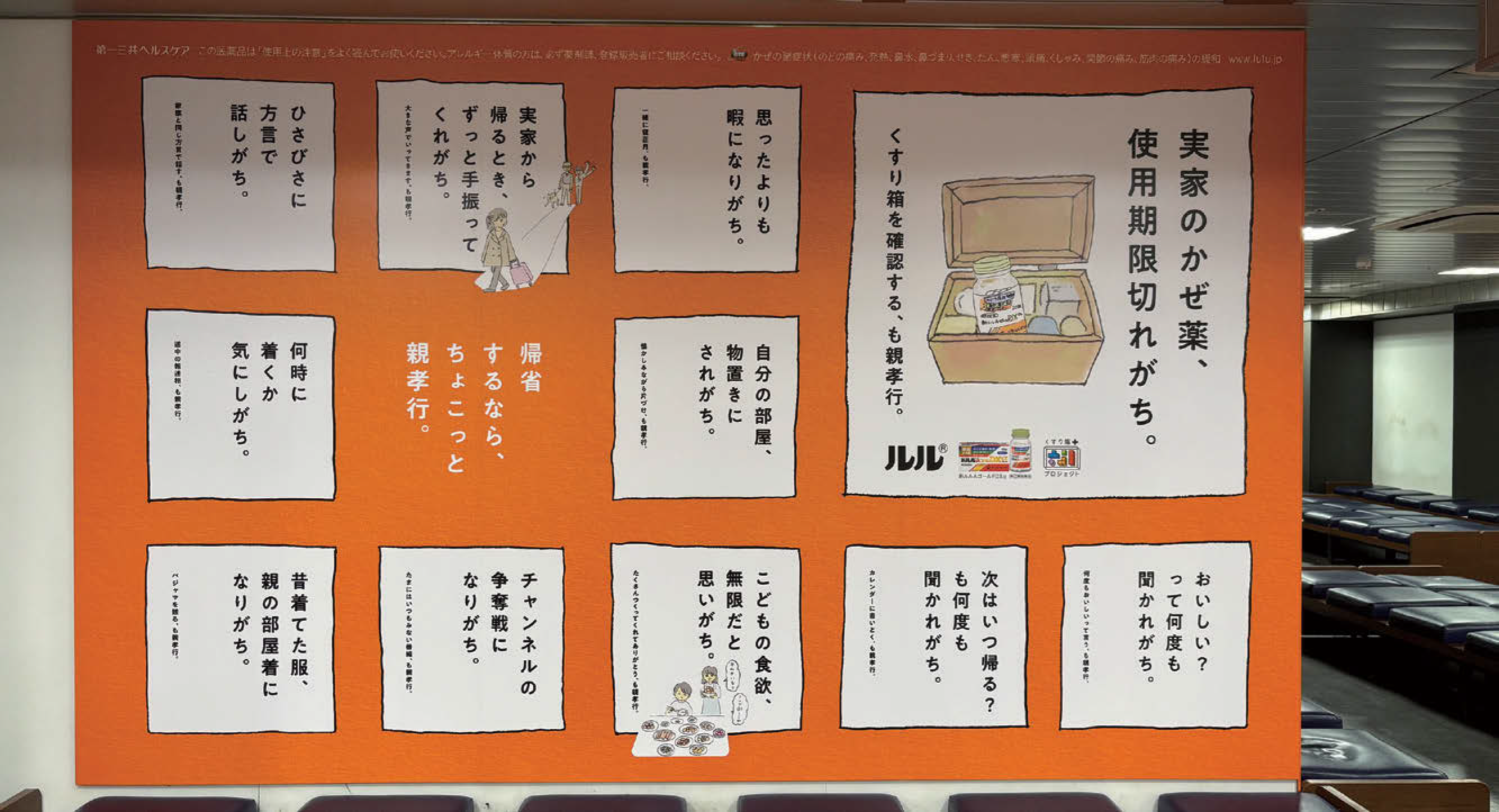 第一三共ヘルスケアは、総合かぜ薬「ルル」のプロモーションとして、2025年12月22日から2026年1月4日まで、JR東京駅・新幹線の待合室で、「帰省するなら、ちょこっと親孝行」をテーマにしたジャック広告を展開した。