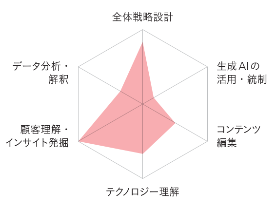 顧客インサイト・自社の戦略・バリューチェーン・データ基盤・現場課題・テクノロジーの変化といった要素を多面的に押さえたうえで、マーケティング全体のアーキテクトとして振舞う役割。