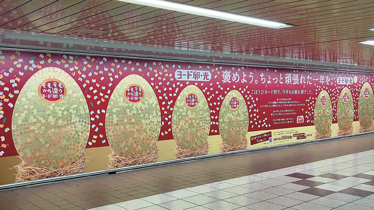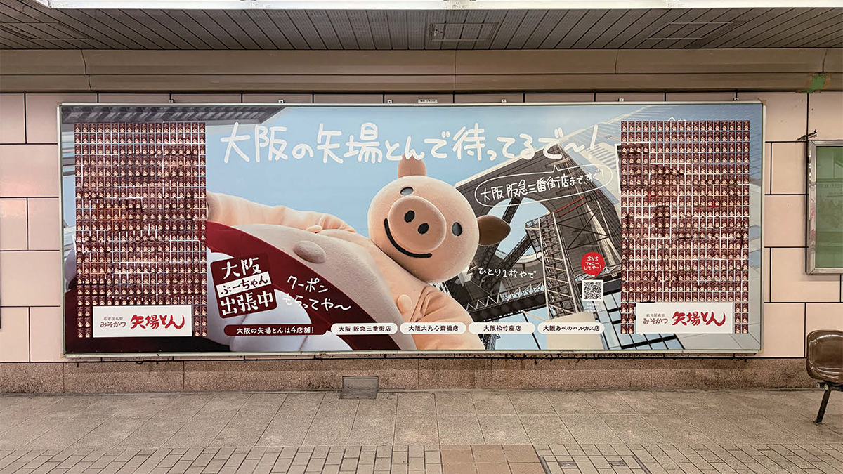 名古屋名物「みそかつ」を展開する「矢場とん」は2025年12月、公式キャラクター「ぶーちゃん」のクーポンカード付きピールオフ広告をOsaka Metro梅田駅、心斎橋駅、なんば駅に掲出した。