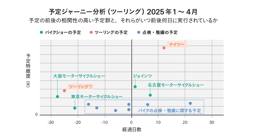 村上:主に「予定ジャーニー分析」と「予定作成タイミング分析」の2つの視点で深掘りしました。予定ジャーニー分析では、カレンダーに「ツーリング」やそれに準じた言葉を入れている人が、その前後にどのような予定を登録しているかを可視化しました【図表】。