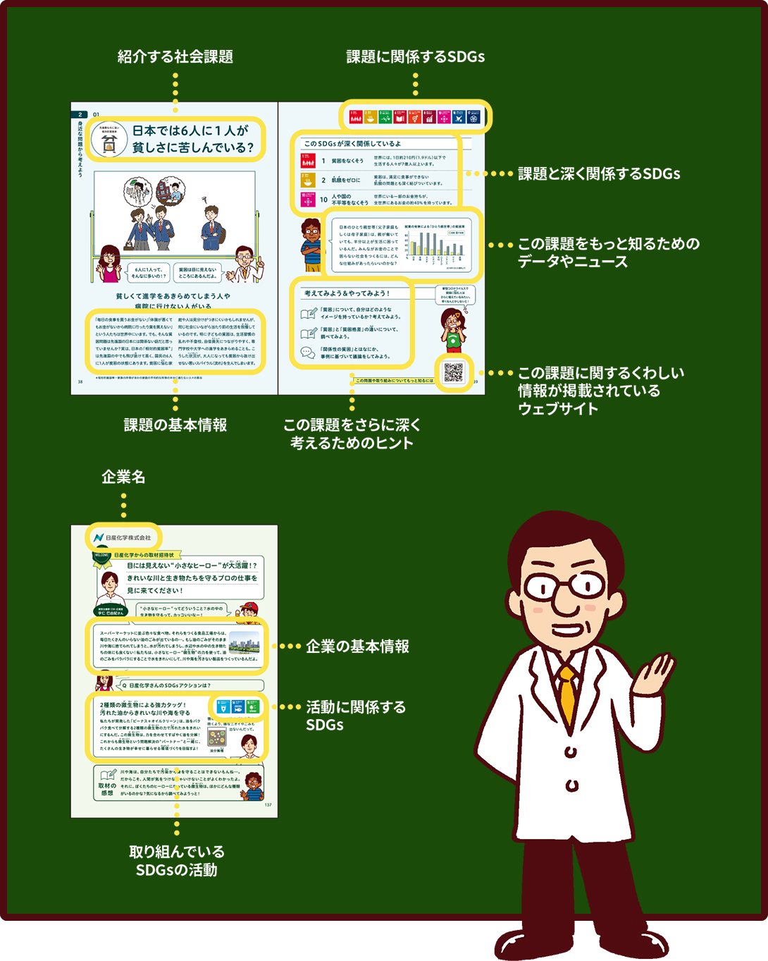本書は、SDGsへの関心と本質的な理解を促す「導入教材」として位置づけるだけではなく、SDGsへの関心・理解から、「私の行動」と「私たちの協働」へとつなげる「態度・行動・協働型教材」として位置づけ、さらには、SDGsと日本の社会課題といったグローカルな課題を取り扱う「グローカル教材」としても位置づけています。また、国連・持続可能な開発のための教育の10年(DESD:2004-2015)を通して蓄積された知見に基づき、ESDレンズと、持続可能性キー・コンピテンシーなどを生かすことによる「探究活動を促す教材」としても位置づけています。